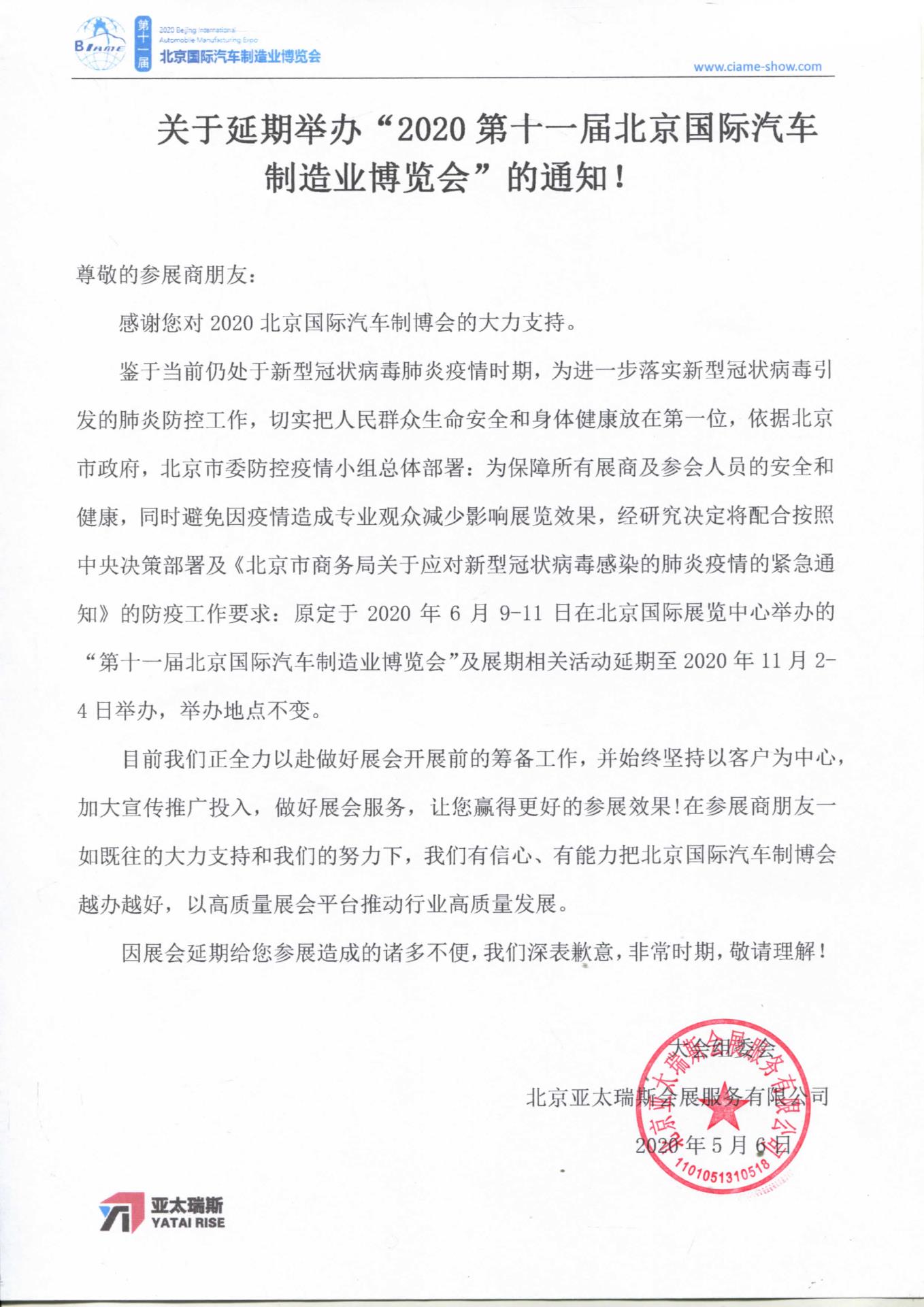 關于延期舉辦“2020第十一屆北京國際汽車制造業博覽會”的通知!