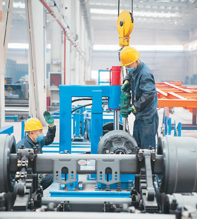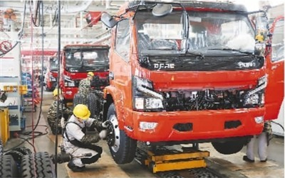 5月3日,位于湖北省襄陽市的東風汽車股份有限公司工程車事業部二總裝車間里一派熱火朝天的景象,為趕生產任務,工程車事業部每天排產近100臺,達同期產能水平150%。圖為裝配工人正在緊張地忙碌。王虎攝(人民視覺)